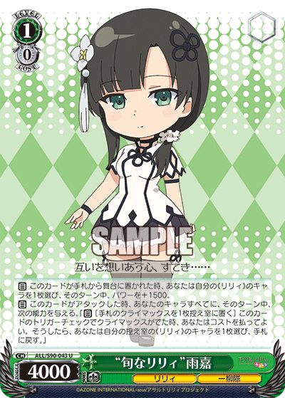【自】 このカードが手札から舞台に置かれた時、あなたは自分の《リリィ》のキャラを1枚選び、そのターン中、パワーを+1500。 【自】 このカードがアタックした時、あなたのキャラすべてに、そのターン中、次の能力を与える。『【自】[手札のクライマックスを1枚控え室に置く] このカードのトリガーチェックでクライマックスがでた時、あなたはコストを払ってよい。そうしたら、あなたは自分の控え室の《リリィ》のキャラを1枚選び、手札に戻す。』