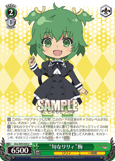 【自】[手札のクライマックスを1枚控え室に置く] 相手のアタックフェイズの始めに、あなたはコストを払ってよい。そうしたら、あなたは他の自分の《リリィ》のキャラを1枚とこのカードを選び、それぞれを【スタンド】して入れ替え、そのターン中、その《リリィ》のキャラのパワーを+1000。