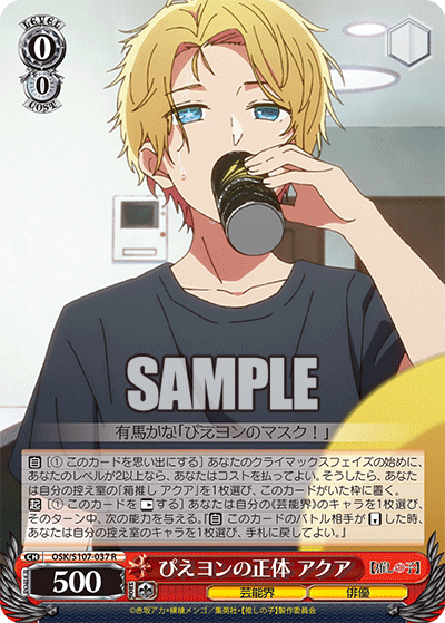 【自】[ このカードを思い出にする] あなたのクライマックスフェイズの始めに、あなたのレベルが2以上なら、あなたはコストを払ってよい。そうしたら、あなたは自分の控え室の「箱推し アクア」を1枚選び、このカードがいた枠に置く。 【起】[ このカードを【レスト】する] あなたは自分の《芸能界》のキャラを1枚選び、そのターン中、次の能力を与える。『【自】 このカードのバトル相手が【リバース】した時、あなたは自分の控え室のキャラを1枚選び、手札に戻してよい。』