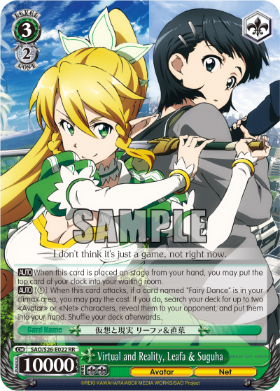 AUTO [①] When this card attacks, if a card named "Fairy Dance" is in your climax area, you may pay the cost. If you do, search your deck for up to two 《Avatar》 or 《Net》 characters, reveal them to your opponent, and put them into your hand. Shuffle your deck afterwards.