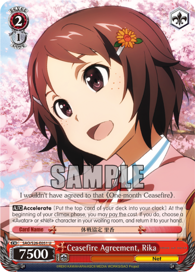 AUTO Accelerate [Put the top card of your deck into your clock] At the beginning of your climax phase, you may pay the cost. If you do, choose a 《Avatar》 or 《Net》 character in your waiting room, and return it to your hand.