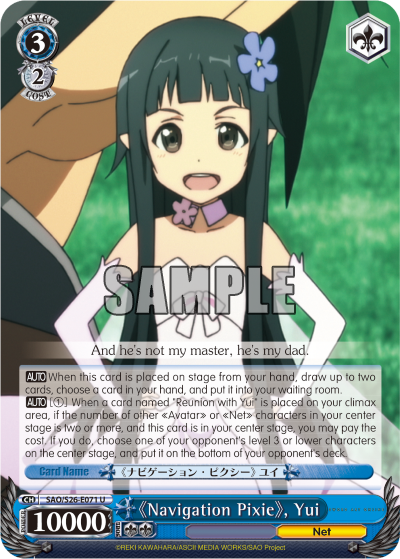 AUTO [①] When a card named "Reunion with Yui" is placed on your climax area, if the number of other 《Avatar》 or 《Net》 characters in your center stage is two or more, and this card is in your center stage, you may pay the cost. If you do, choose one of your opponent's level 3 or lower characters on the center stage, and put it on the bottom of your opponent's deck.