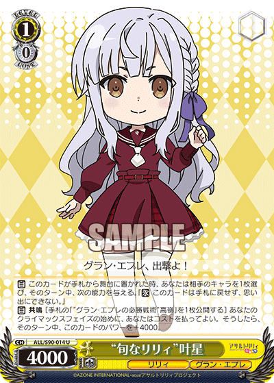 【自】 共鳴 [手札の「“グラン・エプレの必勝戦術”高嶺」を1枚公開する] あなたのクライマックスフェイズの始めに、あなたはコストを払ってよい。そうしたら、そのターン中、このカードのパワーを+4000。