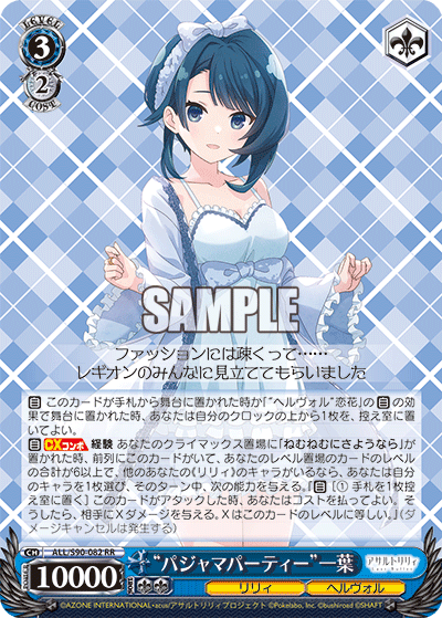 【自】【CXコンボ】 経験 あなたのクライマックス置場に「ねむねむにさようなら」が置かれた時、前列にこのカードがいて、あなたのレベル置場のカードのレベルの合計が6以上で、他のあなたの《リリィ》のキャラがいるなら、あなたは自分のキャラを1枚選び、そのターン中、次の能力を与える。『【自】[① 手札を1枚控え室に置く] このカードがアタックした時、あなたはコストを払ってよい。そうしたら、相手にXダメージを与える。Xはこのカードのレベルに等しい。』(ダメージキャンセルは発生する)