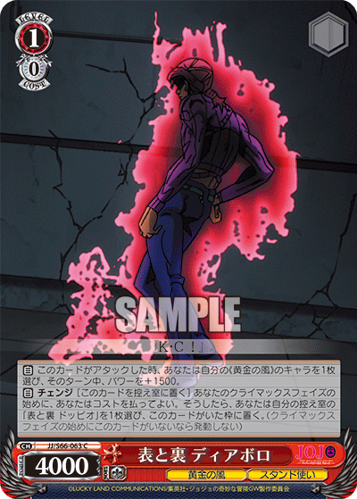 【自】 チェンジ [このカードを控え室に置く] あなたのクライマックスフェイズの始めに、あなたはコストを払ってよい。そうしたら、あなたは自分の控え室の「表と裏 ドッピオ」を1枚選び、このカードがいた枠に置く。(クライマックスフェイズの始めにこのカードがいないなら発動しない)