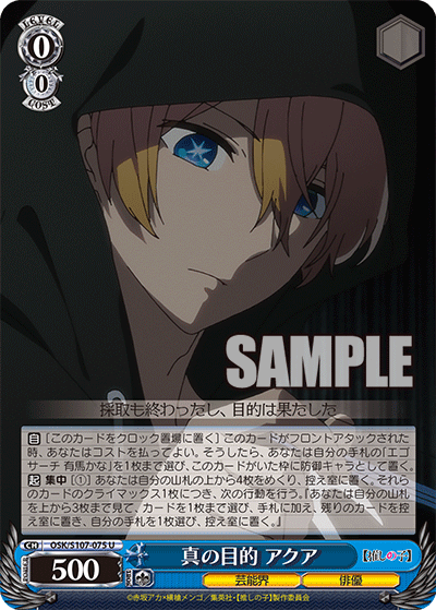【自】[このカードをクロック置場に置く] このカードがフロントアタックされた時、あなたはコストを払ってよい。そうしたら、あなたは自分の手札の「エゴサーチ 有馬かな」を1枚まで選び、このカードがいた枠に防御キャラとして置く。