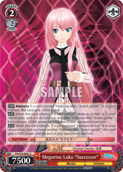 AUTO When this card attacks, if a card named "Akatsuki Arrival" is in your climax area, and you have another "Hatsune Miku "Avant-garde"", this card gets +3500 power until the end of your opponent's next turn.