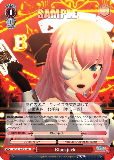 Brainstorm Reveal five cards from the top of your deck, and put them into your waiting room. Deal X damage to your opponent. X is equal to the number of climax revealed among those cards. (This damage may be canceled)