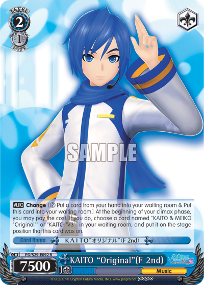 AUTO Change [② Put a card from your hand into your waiting room & Put this card into your waiting room] At the beginning of your climax phase, you may pay the cost. If you do, choose a card named "KAITO & MEIKO "Original"" or "KAITO "V3"" in your waiting room, and put it on the stage position that this card was on.
