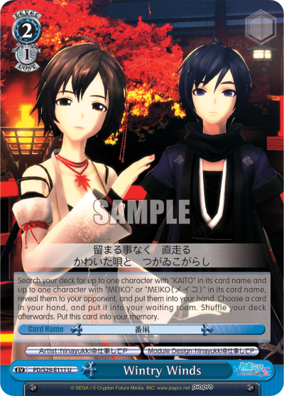 Search your deck for up to one character with "KAITO" in its card name and up to one character with "MEIKO" or "MEIKO(メイコ)" in its card name, reveal them to your opponent, and put them into your hand. Choose a card in your hand, and put it into your waiting room. Shuffle your deck afterwards. Put this card into your memory.
