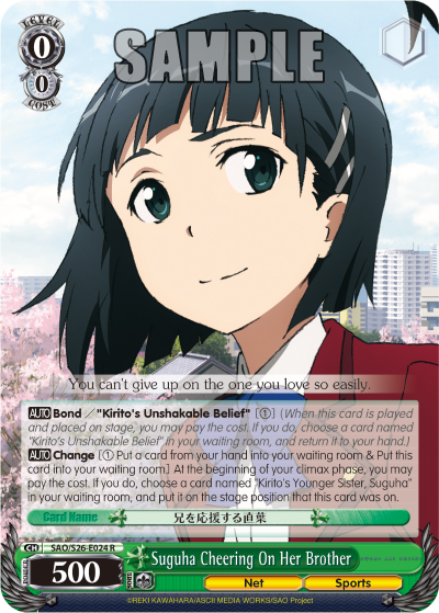 AUTO Change [① Put a card from your hand into your waiting room & Put this card into your waiting room] At the beginning of your climax phase, you may pay the cost. If you do, choose a card named "Kirito's Younger Sister, Suguha" in your waiting room, and put it on the stage position that this card was on.
